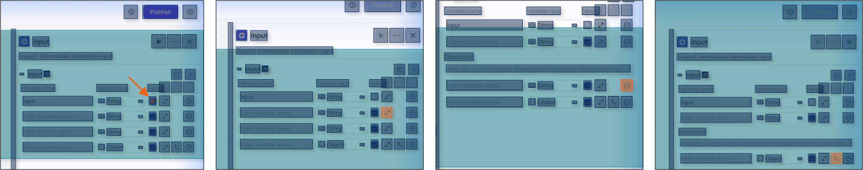 让我们以 Coze.com 的工作流编辑页面为例。这个页面有许多自定义的图标在侧边栏。这对于 LLM 来说很难区分目标元素和它的周围元素。