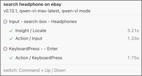 为了解决这个问题,我们引入了 aiTap(), aiHover(), aiInput(), aiKeyboardPress(), aiScroll() 接口。这些接口会直接执行指定的操作,而 AI 模型只负责底层任务,如定位元素等。使用这些接口 后,整个过程可以明显更快和更可靠。