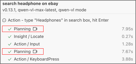 在接口的背后,Midscene 会调用 LLM 来规划步骤并执行它们。你可以在报告中看到整个过程。这是一个非常常见的 AI Agent 运行模式。